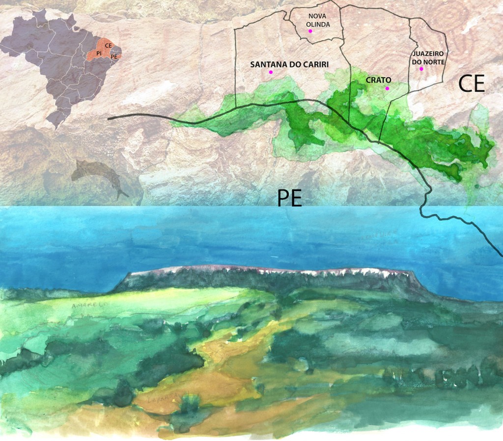O verde da paisagem, a neblina e o frio típico de altiplanos úmidos contrastam com a secura tórrida do Semiárido ao redor. Na divisa do Ceará com Pernambuco, a Chapada do Araripe (do tupi, “água dos papagaios”) guarda a primeira Floresta Nacional brasileira, criada há 70 anos para proteção de nascentes e prática de extrativismo. Abençoado pelo Padre Cícero já na década de 1930 como fonte de alimento no futuro, o lugar é mais do que um oásis em meio ao sertão. Lá afloram jazidas repletas de fósseis, vestígios da vida animal e vegetal quando grandes lagos cobriam a região – hoje a única do Brasil reconhecida mundialmente pela Organização das Nações Unidas para a Educação, a Ciência e a Cultura (Unesco) como geoparque [1].