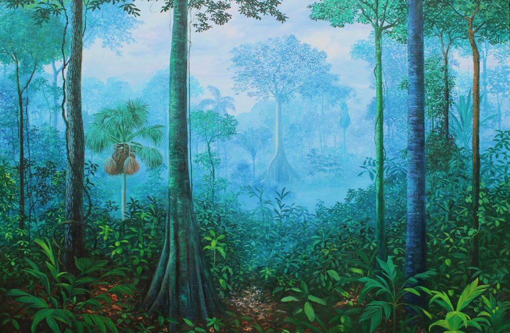 As monumentais paisagens florestais pintadas pelo artista mato-grossense Miguel Penha Chiquitano e exibidas durante o evento representam muito mais do que cenários. Elas evocam um ambiente sensível que envolve corpo e percepção, criando a sensação de estar na floresta. Nesse sentido, suas pinturas dialogam com a ideia de restauração florestal. Regenerar uma floresta não significa apenas recuperar cobertura vegetal, mas recriar condições para que presenças complexas voltem a habitá-la.